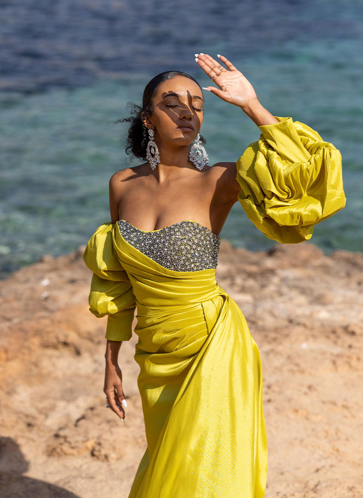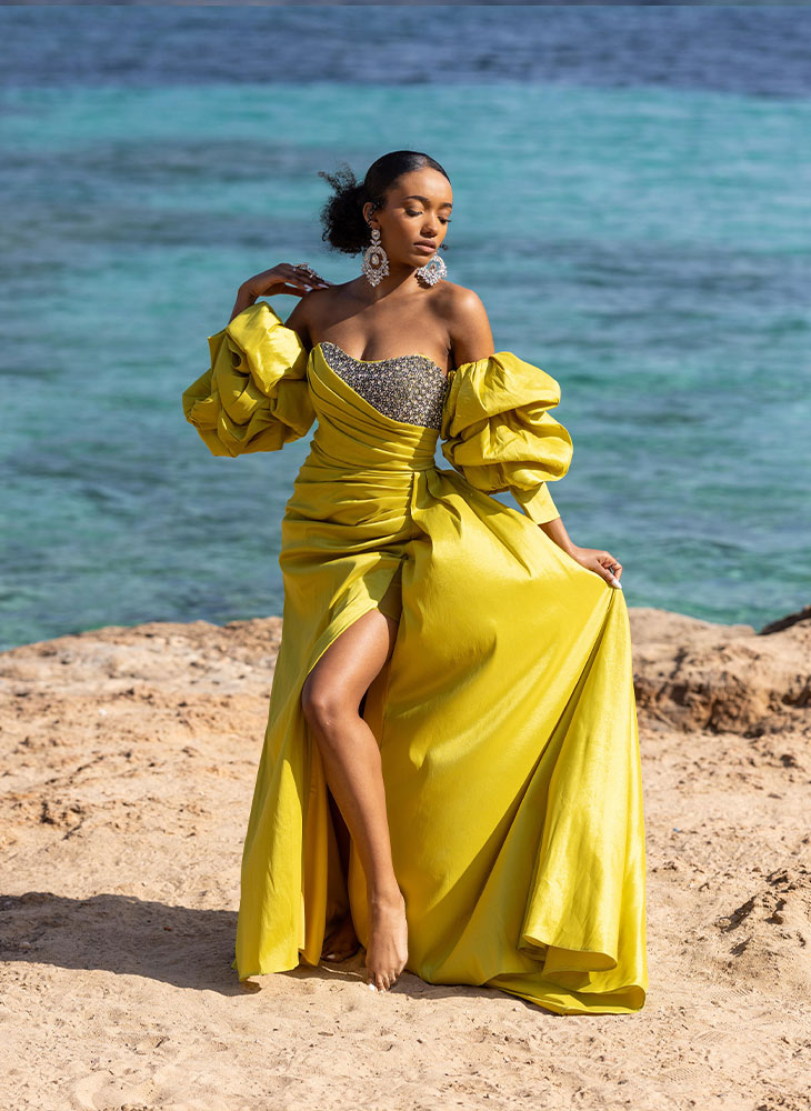 Step into the enchantment of the Xaria dress, inspired by Zariah, meaning blossoming beauty helped by god. This floor length gown embellished with diamanté detailing on the bust and beautifully arranged pleats is delightfully captivating. The exaggerated ruffle sleeves can be worn both with or without the dress. This dress features a mid split for that added femininity and elegance.