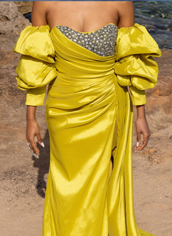 Diamanté bust exaggerated sleeve split gown
